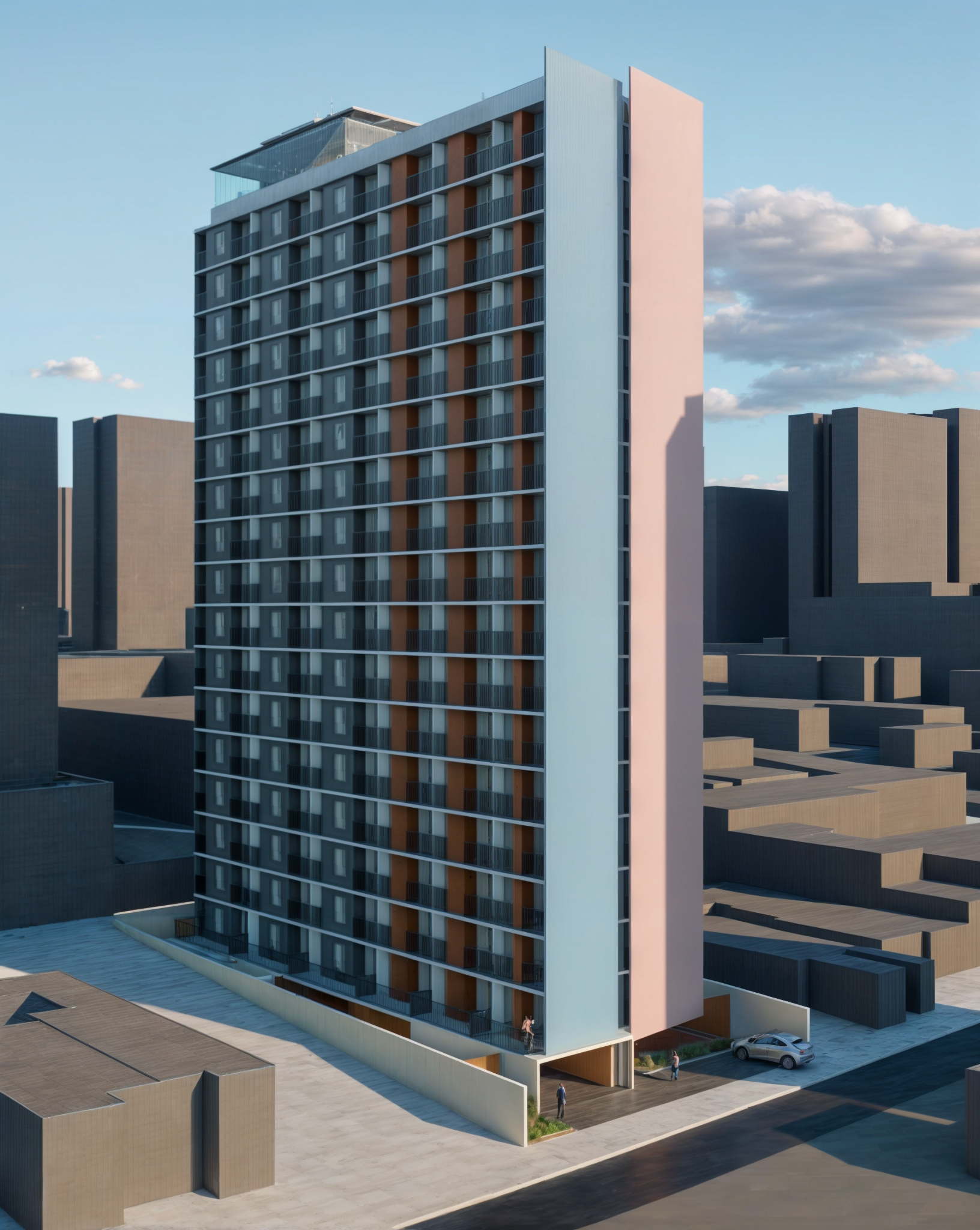 Nossa arquitetura é projetada para ser inovadora e funcional. Em um pequeno gesto arquitetônico, uma fresta divide o que antes era uma grande empena cega, trazendo movimento para a fachada e dando oportunidade para uma comunicação visual que virará uma referência ao bairro. Combinando materiais distintos nas varandas, ressaltamos as volumetrias criando uma sensação de maior verticalidade ao edifício, contrastando as lajes marcadas nas fachadas laterais.